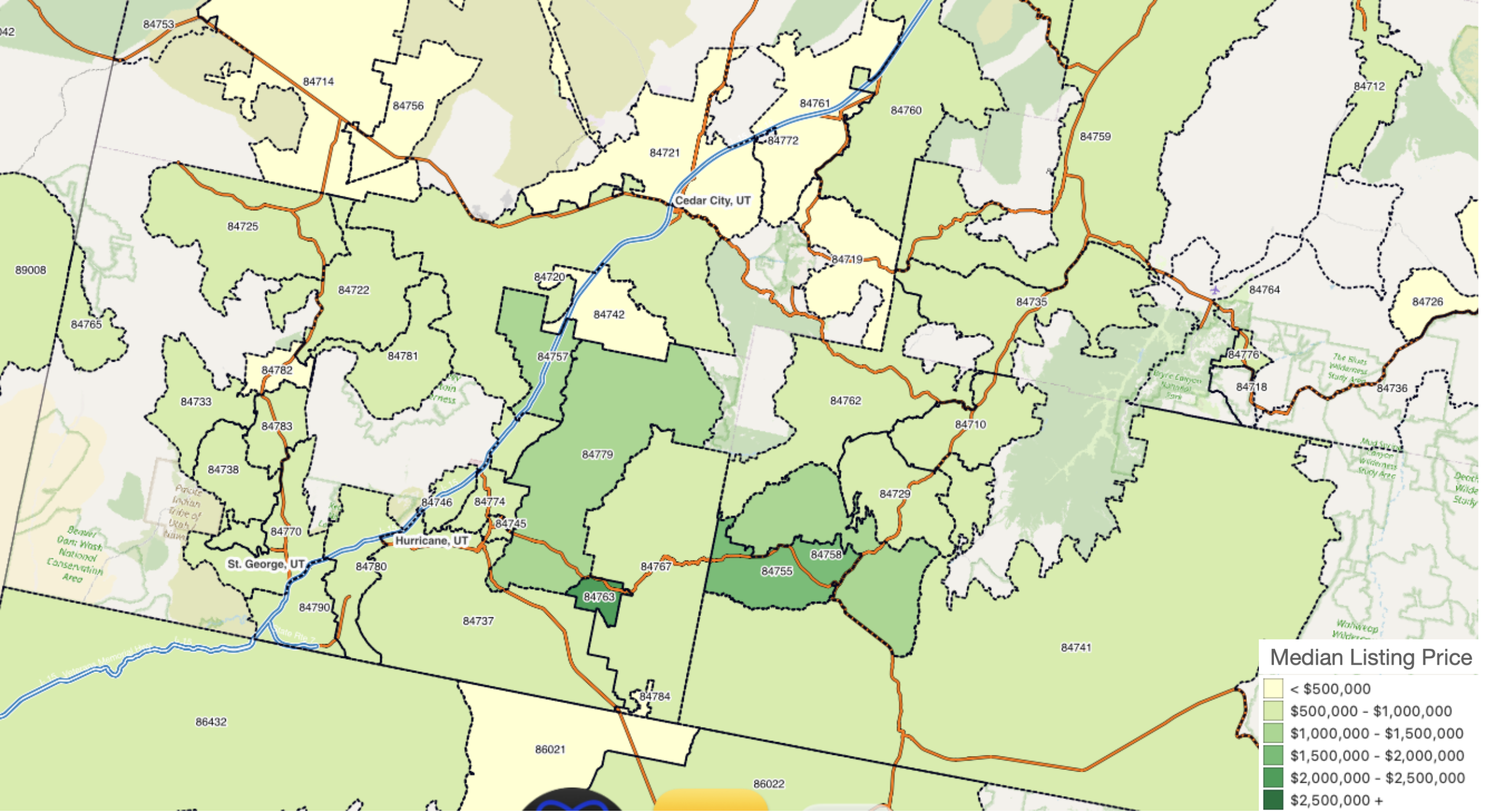 Here we can see the median listing price for homes in April 2025, mostly on the I-15 corridor through Southern Utah.